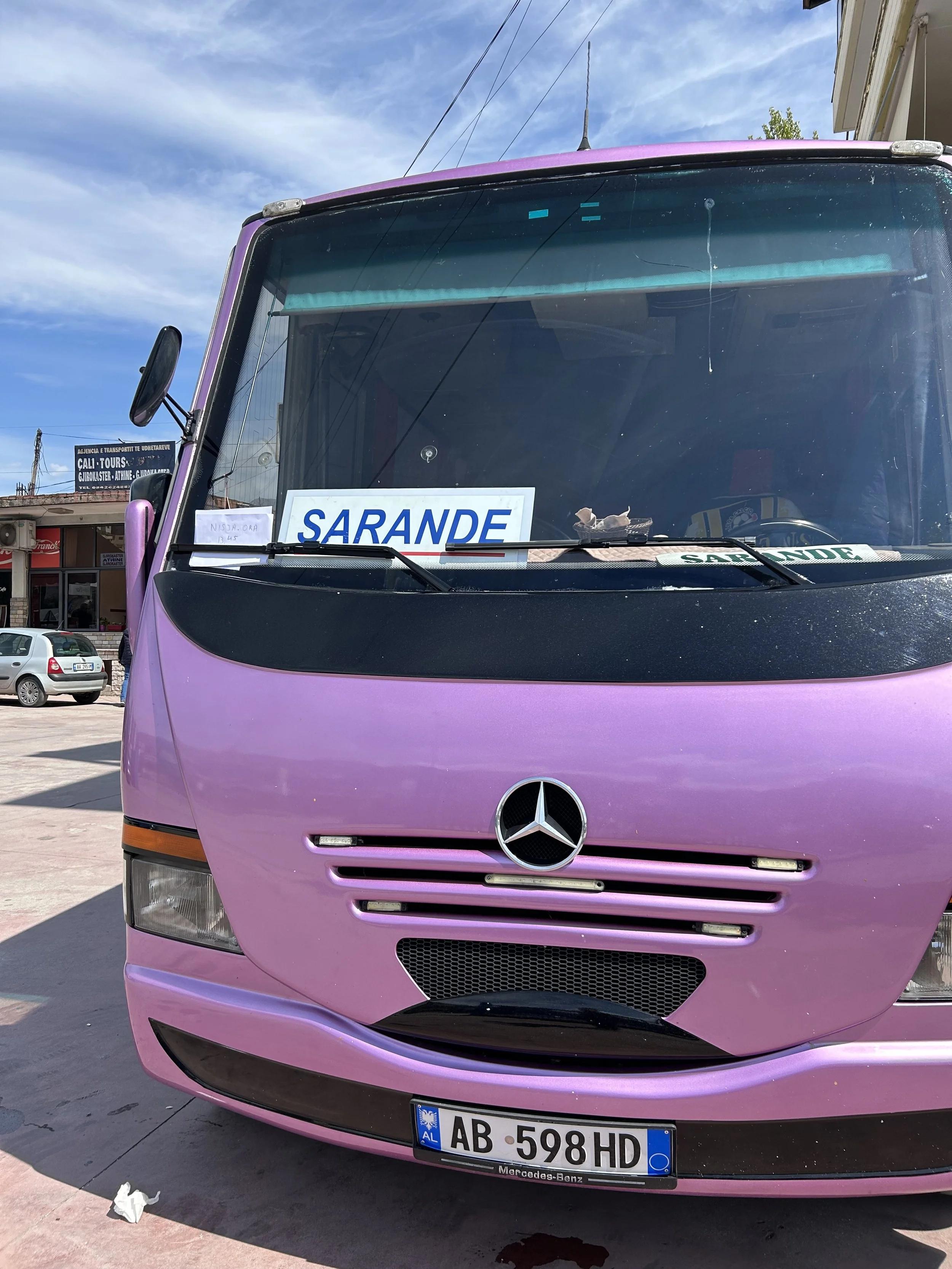 バス停に着くと、大きく”Sarandë”と窓に書かれたバスがあってすぐにわかったが、ドライバーは見当たらなかった。旦那ちゃんが聞き回ってくれて、出発は13:30だと判明。今は11:30…。心の中で”またホテルに戻って送ってくれたらいいな”と少し期待したけれど、アルバニア人からするとそのくらい待つのは普通らしい。その時”だからカフェが多いんだな!”と妙に納得。もちろんコーヒー好きな国民性もあるけど、時間にルーズだからこそ”予定までたっぷりある=最高”となり、ゆっくりカフェ…という流れなんだと勝手に解釈(笑)。