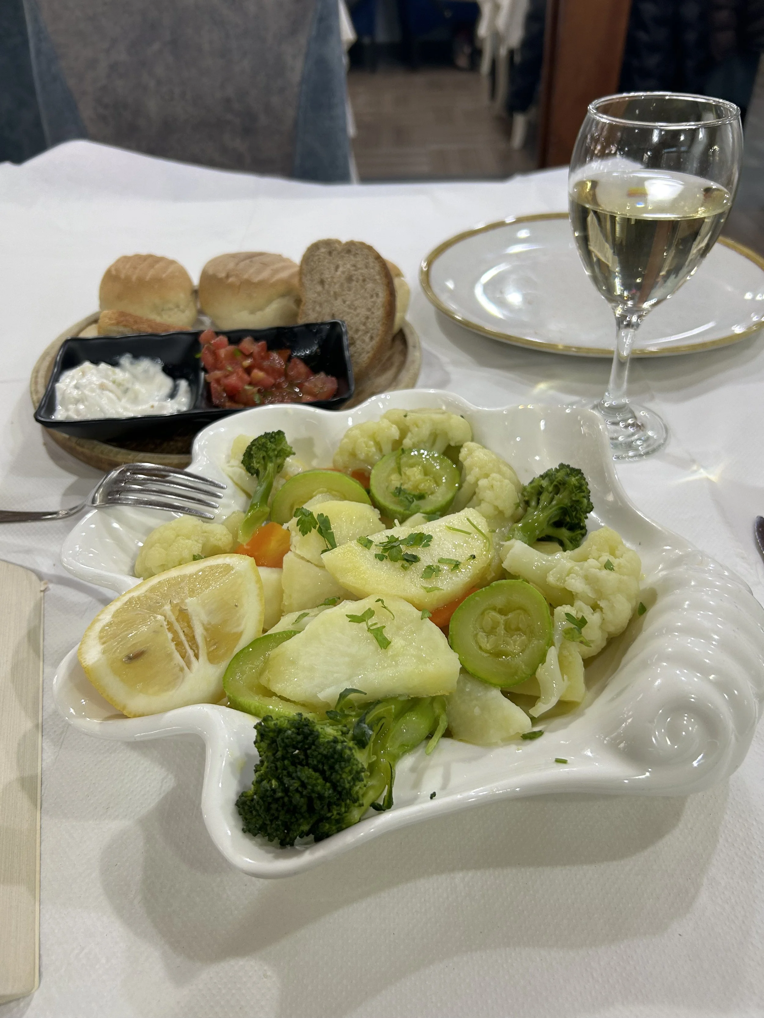もちろんワインからスタート!体が野菜を欲していたので、シンプルな茹で野菜と海鮮パスタを注文。野菜はオリーブオイルたっぷりにレモンを絞っただけなのに、体に染みわたるほど美味しい。そしてパスタ!これが本当に最高だった。量はけっこうあったのに、気づけば完食。お腹は幸せいっぱいでパンパン!