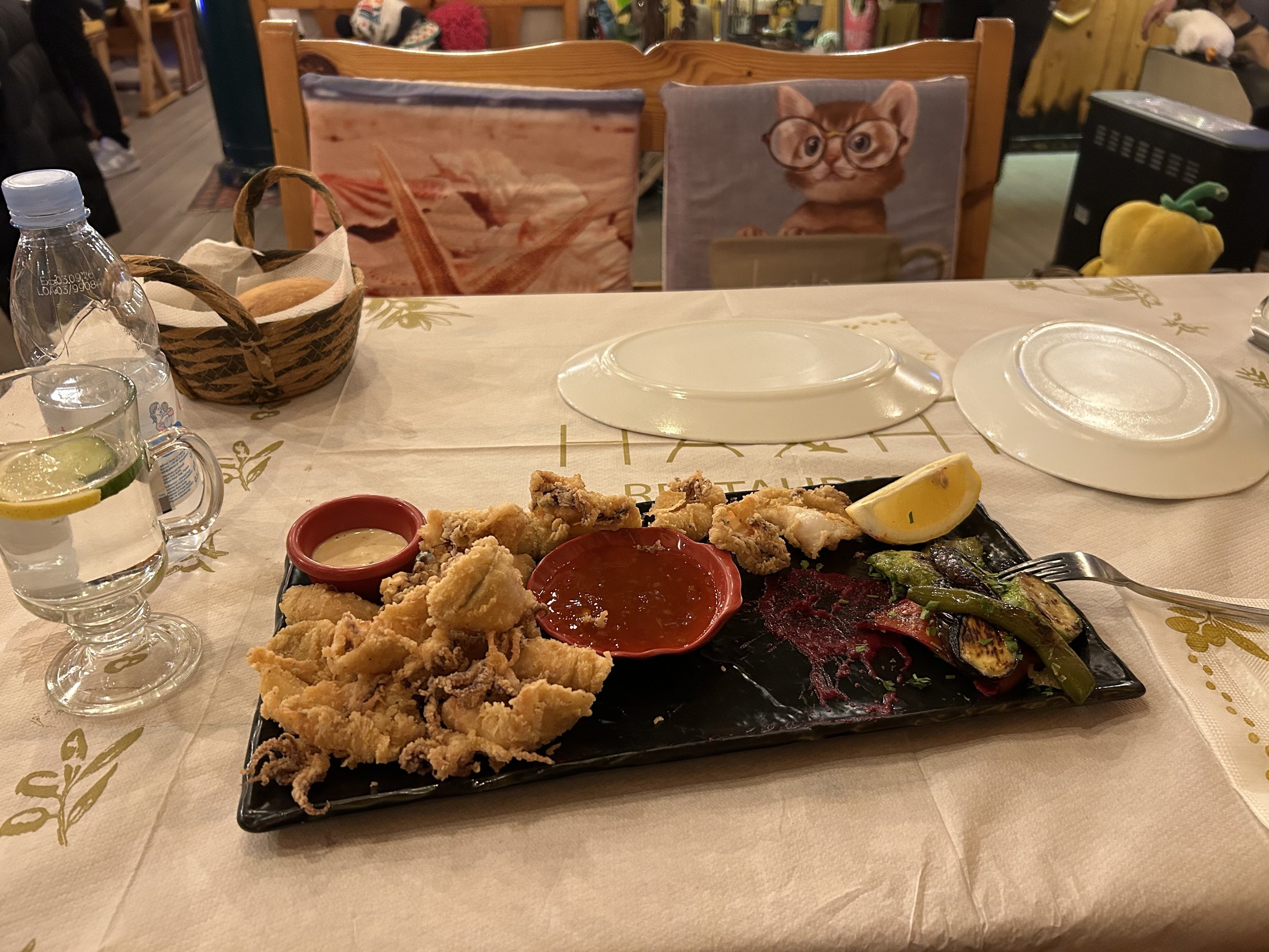 私は酔いながらも”やっぱり何か食べたい”と思い、予定していたレストランHaxhiへ。バーから歩いて数分、2階にあるお店は外観からカラフルで、店内は活気にあふれていた。イカのフリット(Fried Calamari)を注文。酔っ払いの空きっ腹には完璧すぎる選択。ついでにワインも。なみなみと注がれたグラスに気分はさらに上がる。ウエイターに”Ada(ジロカストラでの宿主)に教えてもらった”と伝えたら友達らしく、ちょっとローカル気分で嬉しくなった。フリットがとにかく絶品!タレも美味しいけど、そのままでも最高。ボリュームもたっぷりで”極楽浄土”とはまさにこのこと。幸せいっぱいでホテルに戻った。